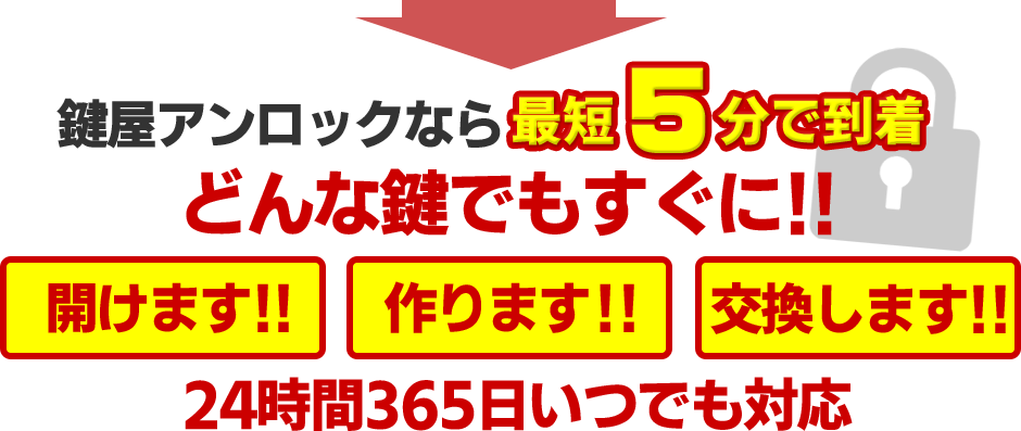 - 鍵の構造や種類などによりますが、基本的に5分~15分程で開錠が可能です。もし時間がかかるようでしたら、作業開始前にお客様に状況をお伝えしてから作業へと入ります。