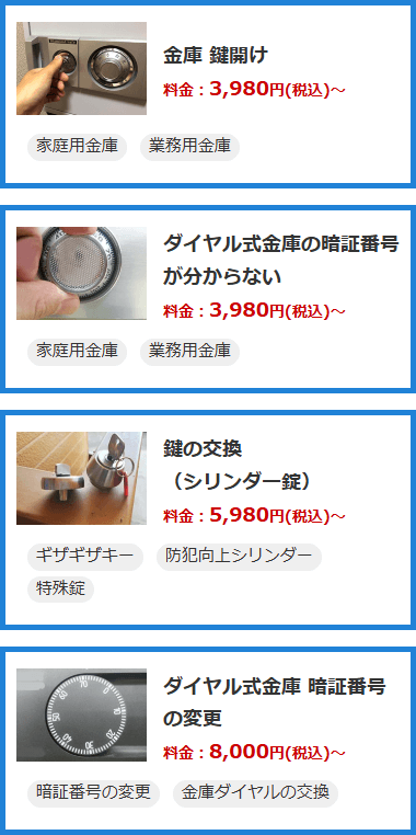 - ダイヤル式金庫ですと、料金は3,980円(税込)~+出張費2,000円(税込)~で承っております。金庫のつくりや状態によっても異なりますので、詳しくはお問合せください。